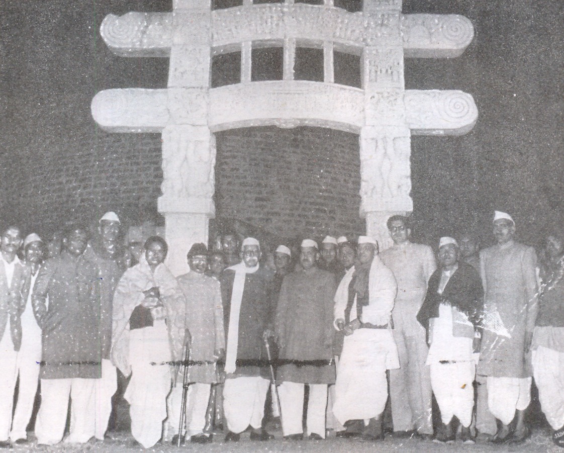 विश्व विख्यात सांची स्तूप के अवलोकन के समय का छायाचित्र. चित्र में तत्कालीन भोपाल पार्ट-सी के मुख्यमंत्री डॉ. शंकरदयाल शर्मा, मध्यभारत के मंत्री श्री गोपीकृष्ण विजयवर्गीय, भोपाल स्टेट के मंत्री मौलाना तरजी मशरिकी, रायसेन क्षेत्र के विधायक श्री बाबूलाल कमल भी दृष्टवय है. |