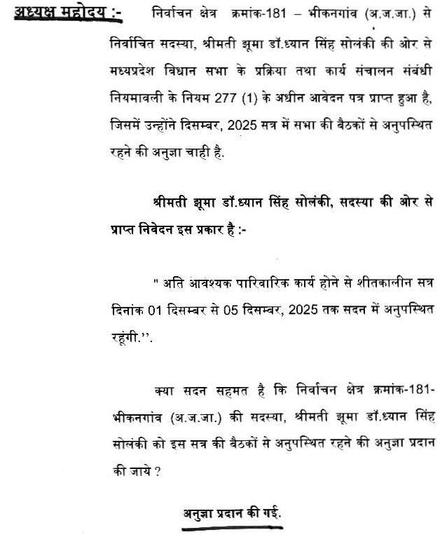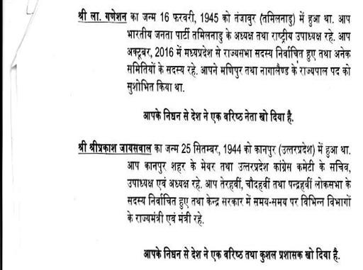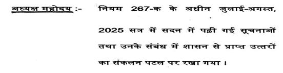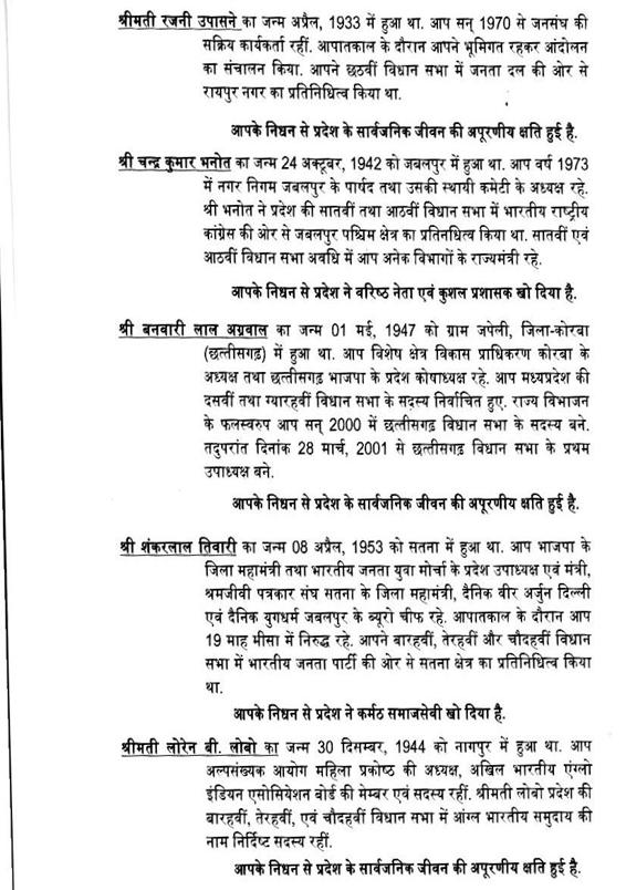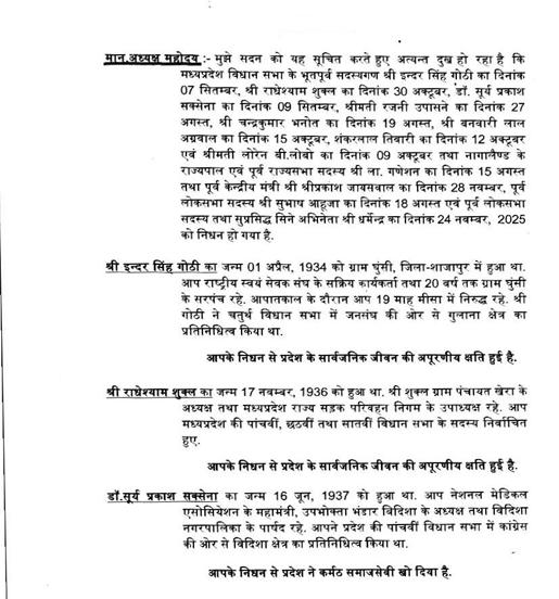 मुख्यमंत्री (डॉ.मोहन यादव)—माननीय अध्यक्ष जी जैसा कि आपने उल्लेखित किया है कि हमारे विधान सभा के भूतपूर्व सदस्यगण स्वर्गीय श्री इन्दर सिंह गोठी, स्वर्गीय श्री राधेश्याम शुक्ल जी, डॉ.सूर्यप्रकाश सक्सेना जी, श्रीमती रजनी उपासने जी, स्वर्गीय श्री चन्द्रकुमार भानोत जी, स्वर्गीय श्री बनवारीलाल अग्रवाल जी, श्री शंकरलाल तिवारी जी, स्वर्गीय श्रीमती लोरेन बी.लोबो जी, नागालैण्ड के राज्यपाल एवं भूतपूर्व राज्यसभा सदस्य ला गणेशन जी, मान्यवर श्री प्रकाश जायसवाल जी, श्री सुभाष आहूजा जी, हमारे सुप्रसिद्ध अभिनेता धर्मेन्द्र जी सहित कई महत्वपूर्ण हस्तियां हमारे बीच से गई हैं जैसा कि आपने उल्लेखित किया है कि स्वर्गीय श्री इन्दर सिंह गोठी 1 अप्रैल 1934 को ग्राम हुंसी से आप राष्ट्रीय स्वयं सेवक संघ के सक्रिय स्वयं सेवक रहे हैं जिनकी अपनी पहचान रही है. आप प्रारंभ सरपंच के जीवन से करते हैं बाद में आपातकाल में भी जनतंत्र की लड़ाई लड़ते हुए 19 महीने तक तत्कालीन कांग्रेस सरकार के विरोध में अपनी न केवल अपने परिवार को दांव पर लगाकर कई कठिनाइयों के बीच भी आपने अपने जनतंत्र की लड़ाई को जारी रखा और चतुर्थ विधान सभा में जनसंघ की ओर से गुलाना का आपने प्रतिनिधित्व किया. आपके निधन से भी सार्वजनिक जीवन में अपूरणीय क्षति हुई है. श्री राधेश्याम शुक्ल पंचायत खेरा के अध्यक्ष, राज्य परिवहन निगम के उपाध्यक्ष, आप मध्यप्रदेश की पांचवी, छठवीं और सातवीं विधान सभा के माननीय सदस्य रहे हैं आपके निधन से भी सार्वजनिक जीवन की अपूरणीय क्षति हुई है. डॉ.सूर्यप्रकाश सक्सेना जी, नेशनल मेडिकल एसोसिएशन के महामंत्री, उपभोक्ता भंडार विदिशा के अध्यक्ष, विदिशा नगरपालिका का पार्षद, आपने प्रदेश की पांचवी विधान सभा में कांग्रेस की ओर से विदिशा क्षेत्र का प्रतिनिधित्व किया आपके निधन से प्रदेश ने कर्मठ समाजसेवी खोया है. श्रीमती रजनी उपासने जी महिला कार्यकर्ता के नाते से जनसंघ के जमाने से हमारे बीच में बड़ा नाम रही हैं. आप 1970 से कार्यकर्ता रही हैं आपातकाल में भी भूमिगत होकर के आपने आंदोलन का संचालन किया. छठवीं विधान सभा में भी आप जनता दल की ओर से रायपुर नगर का प्रतिनिधित्व करते हुए आपने अपनी एक पहचान बनाई थी आपने निधन से एक महिला नेत्री को हम लोगों ने खोया है. श्री चन्द्रप्रकाश भानोत जी, आपका जन्म जबलपुर में हुआ आप 1973 में पार्षद बने, स्थायी कमेटी के अध्यक्ष रहे. श्री भानोत जी सातवीं, आठवीं विधान सभा में भारतीय राष्ट्रीय कांग्रेस की ओर से आपने जबलपुर का प्रतिनिधित्व किया. सातवीं, आठवीं विधान सभा अवधि में अनेक विभागों में राज्यमंत्री जी के रूप रहे हैं. आपके निधन से भी एक वरिष्ठ नेता तथा एक कुशल प्रशासक को हमने खो दिया है.
