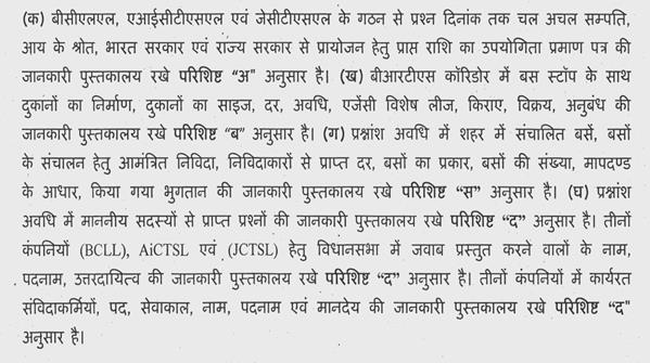 1. ( *क्र. 1368 ) श्री जयवर्द्धन सिंह : क्या नगरीय विकास एवं आवास मंत्री महोदय यह बताने की कृपा करेंगे कि (क) बी.सी.एल.एल., ए.आई.सी.टी.एस.एल. एवं जे.सी.टी.एस.एस. के गठन से प्रश्न दिनांक तक कुल कितनी चल-अचल संपत्ति है? इस संपत्ति के अतिरिक्त और कौन-कौन से आय के स्रोत हैं? कितनी राशि भारत सरकार से, राज्य सरकार से किस-किस प्रयोजन से कब प्राप्त हुई? प्राप्त राशि का उपयोग उपरांत उपयोगिता प्रमाण पत्र प्रस्तुत कर दिया है, तो संपूर्ण जानकारी का पृथक गौशवारा मय दस्तावेजों के दें। (ख) प्रश्नांश (क) के परिप्रेक्ष्य में बी.आर.टी.एस. कॉरिडोर में बस स्टॉप के साथ दुकानों का निर्माण किया गया है? कुल कितनी दुकानें बनाई गईं, दुकानों का साईज क्या है? इन दुकानों को किसे किस दर पर कितनी अवधि के लिये किसी एजेन्सी विशेष को, अन्य किसे लीज, किराये या विक्रय किया गया है? अनुबंध की प्रति सहित संपूर्ण जानकारी का गौशवारा बनाकर बतायें। दुकानों की अद्यतन स्थिति क्या है? (ग) प्रश्नांश अवधि में कितनी-कितनी बसें किस शहर में संचालित हो रही हैं? बसों के संचालन के लिये कितनी निविदा आमंत्रित की गई ? किन निविदाकारों से किस दर पर किस प्रकार की कितनी बसें, किस-किस मापदण्डों के आधार पर क्रय की गईं? कब-कब, कितना-कितना भुगतान किस माध्यम से किया गया? वर्षवार, शहरवार, एजेन्सीवार पृथक-पृथक गौशवारा बनाकर बतायें। (घ) प्रश्नांश अवधि में कितने प्रश्न किस माननीय सदस्यों के कब-कब प्राप्त हुये हैं? संपूर्ण प्रश्नों का गौशवारा बनाकर बतायें। विधानसभा में जवाब प्रस्तुत करने वालों, कार्यों के लिये किन्हें क्या जिम्मेदारी तीनों कंपनियों को सौंपी गई थी, उनके नाम, पदनाम, उत्तरदायित्व सौंपा गया था? तीनों कंपनियों में कितने संविदाकर्मी किस पद पर कब से कार्यरत हैं, उनका सेवाकाल कब-कब बढ़ाया गया? नाम, पदनाम, मानदेय सहित गौशवारा बनाकर बतायें।