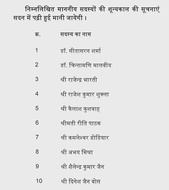 अध्यक्ष महोदय- श्री जवाहरलाल नेहरू कृषि विश्वविद्यालय जबलपुर के प्रबंध मंडल के लिए राज्य विधानसभा के तीन सदस्यों के निर्वाचन के संबंध में घोषित किए गए क्रमानुसार नाम वापसी के पश्चात् केवल तीन उम्मीदवार शेष है उक्त कृषि विश्वविद्यालय के लिए तीन सदस्य ही निर्वाचित किए जाने हैं. अत: मैं निम्नानुसार सदस्यों को जवाहरलाल नेहरू कृषि विश्वविद्यालय जबलपुर के प्रबंध मंडल के लिए निर्विरोध निर्वाचित घोषित करता हूं.