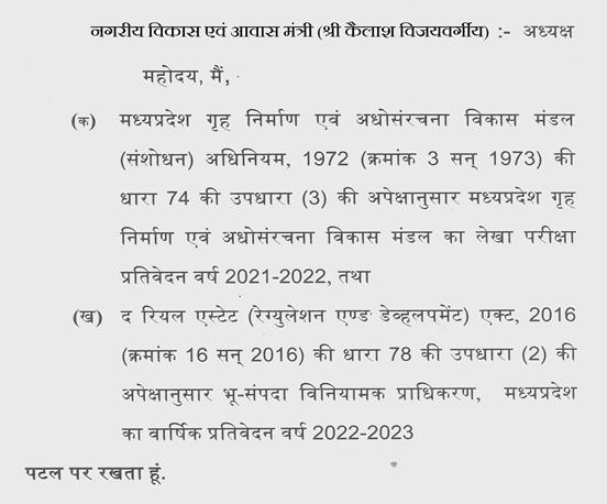 नगरीय विकास एवं आवास मंत्री ( श्री कैलाश विजयवर्गीय ) :