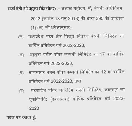 श्री प्रद्युम्न सिहं तोमर -- माननीय अध्यक्ष महोदय, मैं आपके माध्यम से सम्मानित सदस्य को बताऊंगा कि वर्तमान में इनके क्षेत्र में 496 किलोमीटर केबलीकरण है. उसमें से हमारे ट्रिपल आईडीएस में अभी 224 किलोमीटर केबल बदलने का प्रस्ताव है, उसे हम बदलेंगे. साथ ही सम्माननीय सदस्य ने जो बिल के बारे में चिंता जताई है, मैं यह चाहूँगा कि आपके बिलों में कोई शिकायतें हैं तो हमारे संबंधित एसई को जाकर वे शिकायतें आप बताएं और जो बिल त्रुटिपूर्ण होगा, विभाग की कोई कमी होगी, उसको सुधारा जाएगा. यह मैं आपको आश्वस्त करता हूँ.