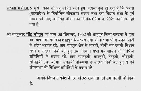 मुख्यमंत्री (श्री शिवराज सिंह चौहान)-- माननीय अध्यक्ष महोदय, अभी भी यह भरोसा नहीं होता है कि नंदू भैया हमारे बीच में नही रहे. वह जन्मजात नेता थे छात्र जीवन से उन्होंने राजनैतिक यात्रा प्रारंभ की थी. वह दो बार शाहपुर नगर पंचायत के अध्यक्ष रहे, तीन बार इस सदन के सदस्य रहे और छ: बार वह देश की सबसे बड़ी पंचायत लोक सभा में जनता के प्यार और आशीर्वाद से चुनकर गए. संगठन के काम में भी उनका कोई मुकाबला नहीं था वैसे तो वह पूरे प्रदेश में प्रदेश अध्यक्ष रहे वह दो बार भारतीय जनता पार्टी के प्रदेश अध्यक्ष भी रहे. उन्होंने दिन और रात परिश्रम करके पूरे मध्यप्रदेश में भारतीय जनता पार्टी की जड़ें जमाने का काम किया. अध्यक्ष महोदय, निमाड़ की जनता की जुबान पर सदैव यह नारा रहता था '' निमाड़ की नैया नंदू भैया'' उन्होंने पूरी प्रामाणिकता के साथ, मेहनत से जनता की सेवा करके लोगों के दिलों में स्थान बनाया था और चौबीसों घंटे दिन और रात वह अपने क्षेत्र की जनता की सेवा में जुटे रहते थे. वह कुशल संगठक थे, सफल प्रशासक थे. वह पांच बार भारतीय जनता पार्टी के महामंत्री रहे और वह मेरे साथ भी महामंत्री रहे थे. अध्यक्ष के नाते उन्होंने सर्वसामान्य कार्यकर्ताओं के दिलों को जीता था और दूसरी बात वह राजनैतिक मतभेदों से परे थे. परसों जब हम उनको अंतिम विदाई देने गए थे तो हमारे अनेक साथी उनकी अंतिम यात्रा में सम्मिलित हुए थे. अरुण यादव जी और बाकी निमाड़ के कई नेता और कांग्रेस के मित्र भी सम्मिलित थे और वहां जो जनसैलाब उमड़ा वह कल्पना से परे था. शाहपुर की हर गली में जहां देखो जनता का समुद्र दिखाई दे रहा था. हर आंख में आंसू थे, हर घर से फूलों की वर्षा हो रही थी, हर समाज व्यथित था राजनैतिक मतभेद दूर हो गए थे. मैंने कांग्रेस के कार्यकताओं को भी बिलखते हुए देखा है. वह अदभुत् जननेता थे. वह डेढ़ महीने से दौरे कर रहे थे और घर नहीं गए थे. पिछले महीने की ग्यारह तारीख को उन्हें घर जाना था और उसी दिन उनकी कोरोना टेस्ट रिपोर्ट कोरोना पॉजीटिव निकल गई. वे घर से सीधे भोपाल आ गये और अस्पताल में भर्ती रहे. उम्मीद थी कि जैसे बाकी साथी गए और कुछ दिनों के बाद वापस आ गए, वैसे ही वे भी आ जायेंगे लेकिन कोरोना के दुष्प्रभावों के कारण एक दिन अचानक उनका ऑक्सीजन सेचुरेशन कम हुआ.