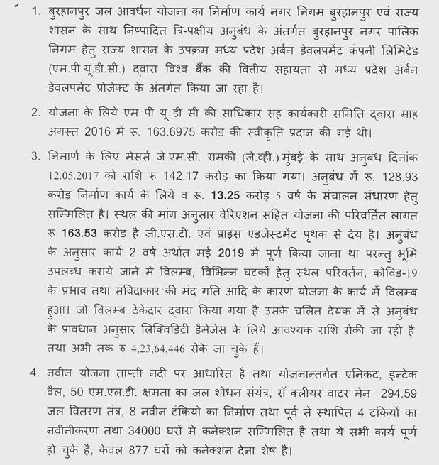 लोक स्वास्थ्य यांत्रिकी मंत्री ( श्रीमती संपतिया उइके ) : (क) नर्मदा-गंभीर परियोजना अंतर्गत उज्जैन जिले के 830 ग्रामों को जोड़ा गया है एवं अनुबंधानुसार संपूर्ण परियोजना कार्य हेतु राशि के प्रावधानित व्यय की जानकारी पुस्तकालय में रखे परिशिष्ट के प्रपत्र 01 अनुसार है। डी.पी.आर. की जानकारी पुस्तकालय में रखे परिशिष्ट के प्रपत्र 02 अनुसार है। (ख) नर्मदा-गंभीर परियोजना अंतर्गत घट्टिया विधानसभा के समस्त 254 ग्रामों को जोड़ा गया है, कोई भी ग्राम छोड़ा नहीं गया है। उक्त परियोजना में सम्मिलित ग्रामों की ग्रामवार जानकारी पुस्तकालय में रखे परिशिष्ट के प्रपत्र 03 अनुसार है। (ग) उक्त परियोजना निर्माण एजेंसी के कार्यादेश से दो वर्ष, सितम्बर 2025 तक पूर्ण होना है। कार्यों के पूर्ण होने की समय-सीमा की संपूर्ण जानकारी पुस्तकालय में रखे परिशिष्ट के प्रपत्र 01 अनुसार है। (घ) जी नहीं, निर्माण एजेंसी द्वारा पेयजल पाइप-लाइन डालते समय सीमेंट कांक्रीट रोड एवं अन्य सड़कों को आवश्यकतानुसार खोदा जाता है तथा पाइप लाइन टेस्टिंग के उपरांत खोदी गई सड़कों को अनुबंधानुसार पुनः यथावत कर दिया जाता है।