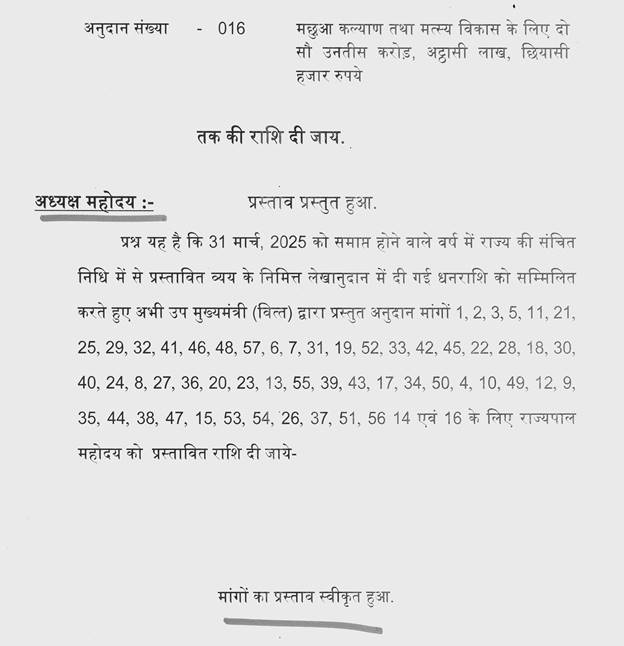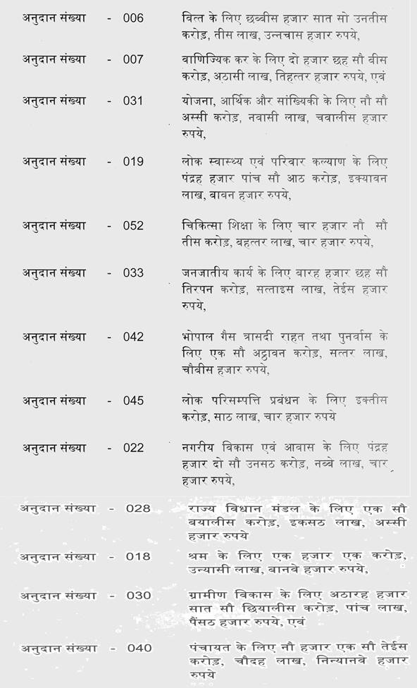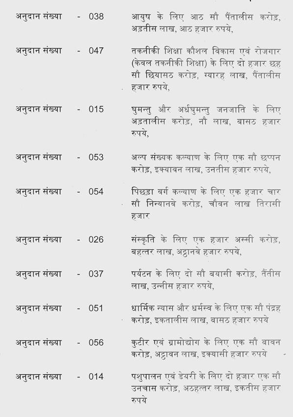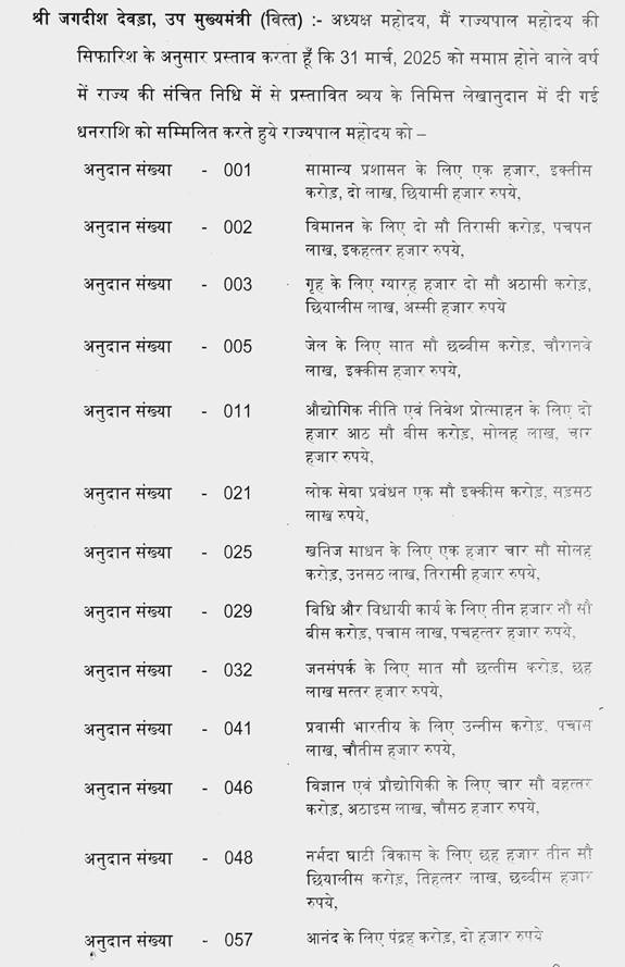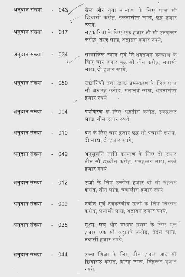 श्री जगदीश देवड़ा-- मैं उसको बता चुका हूं मिश्रा जी. बजट 2024-25 में मुख्य क्षेत्रों में जो प्रावधान हमने किये हैं, जो बार-बार माननीय सदस्यों की तरफ से भी बात आती है कि उसमें राशि नहीं दी, उसमें राशि नहीं दी. सब विभागों में राशि दी है. स्वास्थ्य एवं महिला बाल विकास में 56 प्रतिशत की वृद्धि इस समय की है, पिछले बजट की तुलना में और उद्योग में 39 प्रतिशत की वृद्धि की गई. संस्कृति संवर्धन में 35 प्रतिशत की वृद्धि की गई. हमने यह जो वृद्धि की है यह पिछले बजट की तुलना में यह इतनी ज्यादा वृद्धि की है जो पहले कभी नहीं हुई है. कृषि क्षेत्र में 15 प्रतिशत की वृद्धि की गई. नगरीय एवं ग्रामीण विकास में 13 प्रतिशत की वृद्धि, अधोसंरचना क्षेत्र में 9 प्रतिशत, शिक्षा में 4 प्रतिशत, मुख्यमंत्री लाड़ली बहना 2023 हेतु 18 हजार 984 करोड़ का प्रावधान किया है. राष्ट्रीय स्वास्थ्य मिशन 4 हजार 500 करोड़ रूपये का प्रावधान किया है. राष्ट्रीय रोजगार गारंटी योजना हेतु 3 हजार 500 करोड़ का प्रावधान, सामाजिक सुरक्षा कल्याण हेतु रूपये 2 हजार 400 करोड़ का प्रावधान, प्रधानमंत्री फसल बीमा योजना हेतु 2 हजार 1 करोड़ का प्रावधान, मुख्यमंत्री कृषक फसल उपार्जन योजना हेतु 1 हजार करोड़ रूपये का प्रावधान किया है.