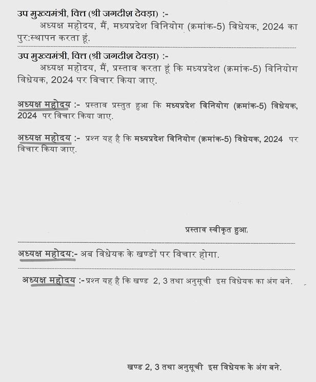 अध्यक्ष महोदय - प्रस्ताव प्रस्तुत हुआ कि मध्यप्रदेश विनियोग (क्रमांक-4) विधेयक,2024 पर विचार किया जाय.