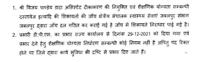 सुश्री निर्मला भूरिया- माननीय सभापति महोदय, माननीय सदस्य ने जो जानकारी चाही है वह बिल्कुल सत्य है और कोई असत्य जानकारी हम लोग यहां पर नहीं दे रहे हैं और जो जानकारी माननीय सदस्या ने पूछी है कि कार्यरत् पदस्थ सहायक ग्रेड-3 एवं चतुर्थ श्रेणी कर्मचारियों की पदक्रम सूची का संधारण संबंधित जिले के जिला कार्यक्रम अधिकारी कार्यालय में किया जायेगा. उक्त शासकीय सेवकों का नाम संबंधित जिले के आरक्षण रोस्टर में रखा जायेगा एवं इनकी पदोन्नति, क्रमोन्नति की समस्त कार्यवाही, संबंधित जिलों के जिला कार्यक्रम अधिकारी द्वारा की जावेगी. यह निर्देश दिये गये हैं कि किसी भी सहायक ग्रेड-3 के कर्मचारी की सहायक ग्रेड-2 के पद पर पदोन्नति नहीं किये जाने से, शेष का प्रश्न ही उपस्थित नहीं होता है और सहायक ग्रेड-2 के पदों पर 100 प्रतिशत पद पदोन्नति से ही भरे जाने का प्रावधान है. सभापति महोदय, उक्त उत्तर से यह प्रश्न उद्भूत नहीं होता है. अभी क्योंकि प्रमोशन पर स्टे है, इसलिये जब भी स्टे खत्म होगा तो हम इस पर जरूर कार्यवाही करेंगे और पदोन्नति करेंगे.