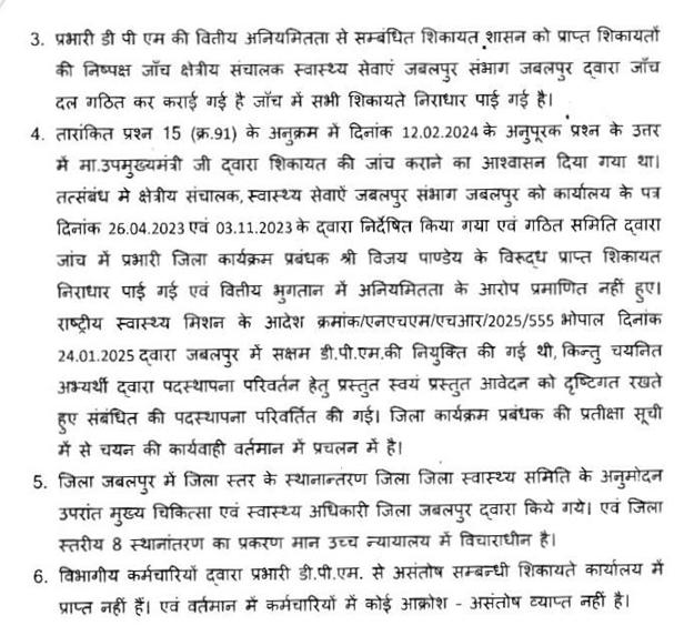 श्रीमती कृष्णा गौर—सभापति जी, यह बात बिलकुल सच है कि माननीय सदस्य द्वारा दिये गये जनसम्पर्क राशि के प्रस्ताव 22.1.2025 को प्राप्त हुए थे और उसको प्रभारी मंत्री जी द्वारा 17.2.2025 को अनुमोदन भी प्राप्त हो गया था. पूर्व में जो प्रस्ताव प्राप्त हुए थे, उनकी प्रशासकीय स्वीकृति 25.3.2025 को हुई, लेकिन खातों में कुछ गलत आंकड़ों की वजह से उसका संशोधन किया गया और संशोधन के पश्चात् 28.3.2025 को उसकी प्रशासकीय स्वीकृति जारी कर दी गई, लेकिन बिल समय पर नहीं लगाने के कारण वह राशि का आहरण नहीं हो पाया और राशि लैप्स हो गई. माननीय सदस्य ने जब इसकी शिकायत की, तो तत्काल उस समय संज्ञान लेते हुए शाखा प्रभारी, इरशाद सूफी, सहायक ग्रेड-3 का निलम्बन एवं तत्कालीन जिला योजना अधिकारी, श्री प्रताप कुमार अगास्या( डिप्टी कलेक्टर) व तत्कालीन जिला कोषालय अधिकारी, आनंद पटले को कारण बताओ नोटिस जारी किया गया.