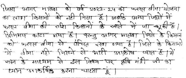 (1) जिला आगर मालवा में फसल बीमा योजना का लाभ किसानों को नहीं मिलने के संबंध में.