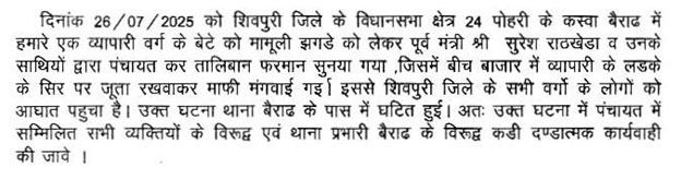 3. विधानसभा क्षेत्र 24 पोहरी के अंतर्गत बैराड़ कस्बे में एक युवक को सार्वजनिक रूप से अपमानित कराने वालों के विरूद्ध कार्यवाही बाबत्.