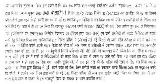 (8) उज्जैन नगर निगम द्वारा निविदा प्रक्रिया में की गई अनियमितता के संबंध में.