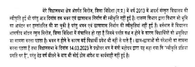(14) विधानसभा क्षेत्र सिंरोज में स्वीकृत संस्कृत विद्यालय के भवन एवं छात्रावास का जल्द निर्माण कराया जाना.