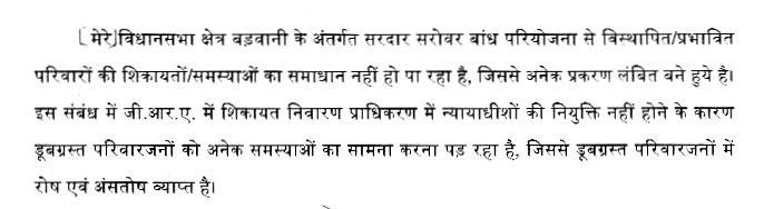 बड़वानी जिले के अंतर्गत सरदार सरोवर बांध परियोजना से विस्थापित/प्रभावित परिवारों की शिकायतों/समस्याओं का समाधान न हो पाना