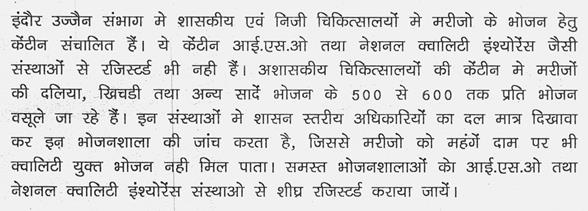 श्री उमाशंकर गुप्ता-- माननीय सदस्य जो कह रहे हैं कि कलेक्टर ने कोई पत्र लिखा है, इसकी जानकारी अभी मेरे पास नहीं है, लेकिन अगर लिखा है तो उस पर भी कार्यवाही होगी. मैंने स्वयं जब यह कहा है कि मैंने जब इस सारे मामले को समझा है और इसमें मुझे लगा है कि कहीं न कहीं इसमें गड़बड़ है, इसलिये संभागायुक्त की अध्यक्षता में हम जांच करायेंगे.