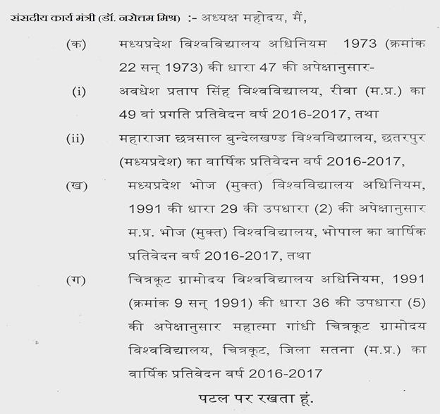 5.30 बजे राज्यपाल के अभिभाषण पर श्री रामेश्वर शर्मा, सदस्य द्वारा दिनांक 26 फरवरी,2018 को प्रस्तुत प्रस्ताव पर चर्चा (क्रमशः)