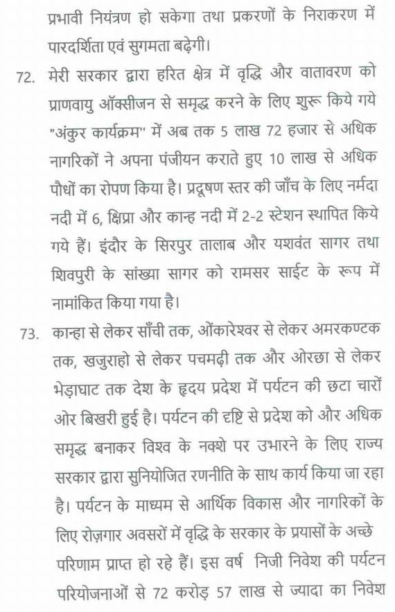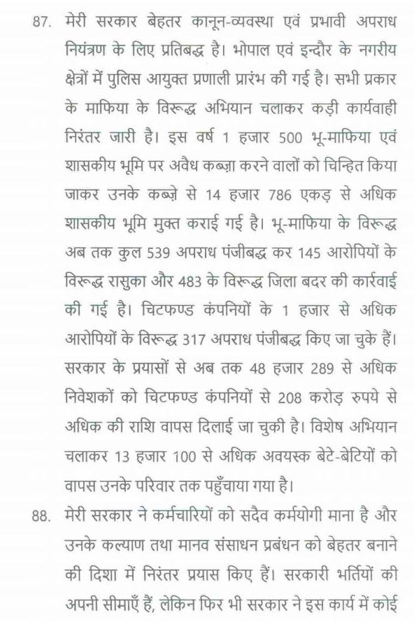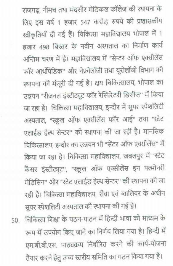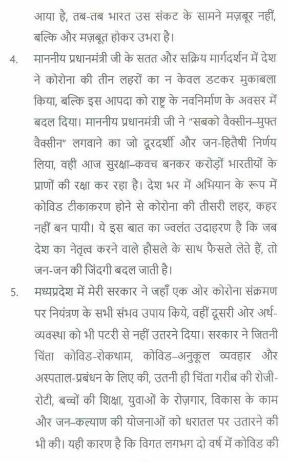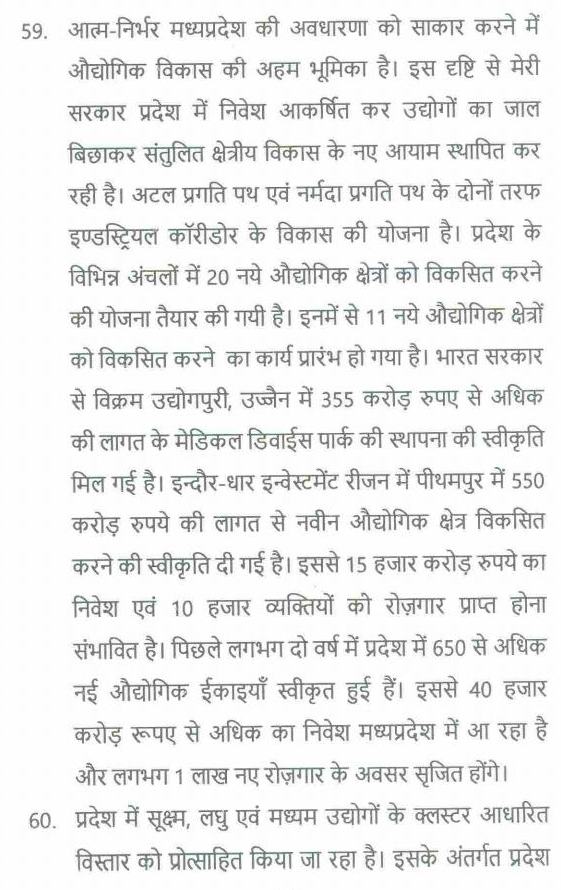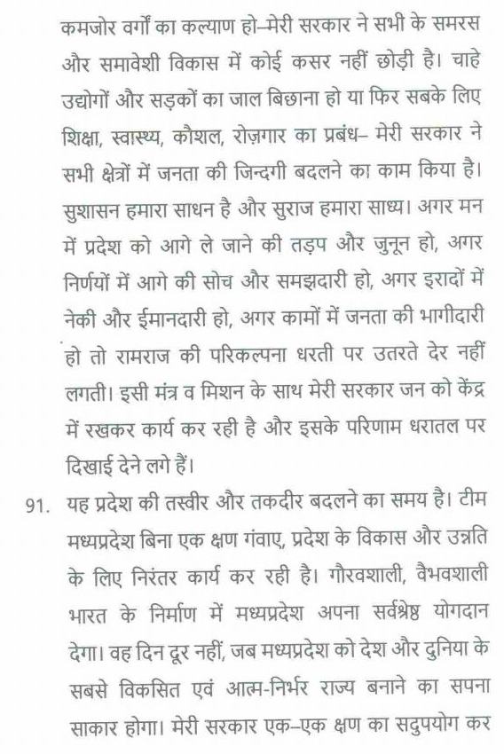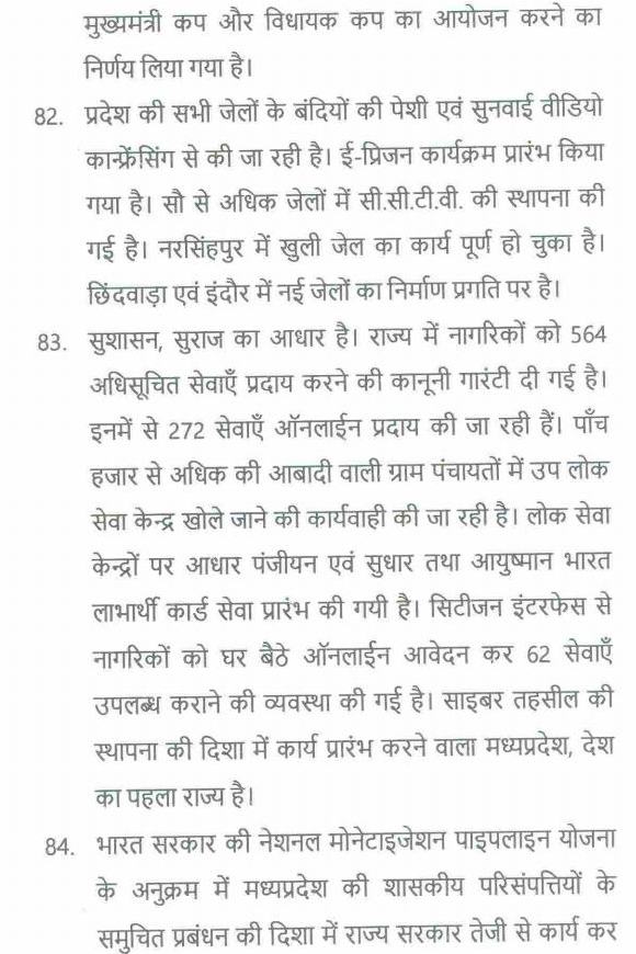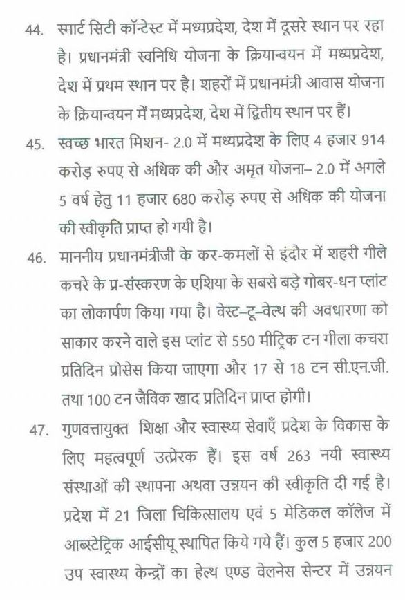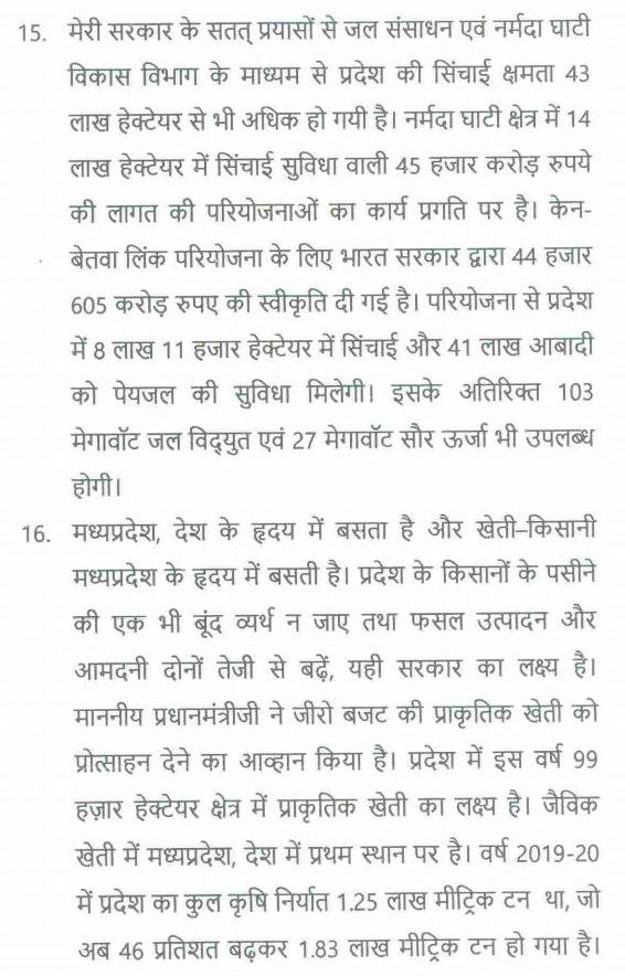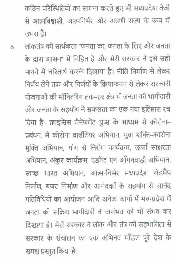 मुख्यमंत्री (श्री शिवराज सिंह चौहान) -- माननीय अध्यक्ष महोदय, सबसे पहले तो मैं नेता प्रतिपक्ष, श्रीमान कमल नाथ जी ने जिस बड़े मन से एक गलत परम्परा का विरोध करते हुए सहमति जताई है, मैं उनको हृदय से धन्यवाद देता हूँ (मेजों की थपथपाहट). पक्ष हो, विपक्ष हो, संसदीय परम्पराओं का पालन करना हमारा धर्म है और मध्यप्रदेश की गौरवशाली परम्परा रही है, इसको उन्होंने आगे बढ़ाने का काम किया है. जहां तक हमारे वरिष्ठ सदस्य माननीय लक्ष्मण सिंह जी ने जो बात कही है, अखबार अपने मन से कई बार गलत, कई बार अंदाज से, गलत-सही कुछ भी अनुमान लगाते रहते हैं और कुछ न कुछ अंदाज से भी लिखते रहते हैं. उसको यह न माना जाए कि वह किसी ने जान के लीक किया है. यह तो सरकार की जवाबदारी है. अब इतना जरूर है, हम 'आत्मनिर्भर मध्यप्रदेश' का रोडमैप बना रहे हैं, हम लोग कहते हैं कि हम इसको प्राथमिकता देंगे, उसको प्राथमिकता देंगे, तो उसमें कई बार अखबार कयास लगाते हैं, अनुमान लगाते हैं. बजट गोपनीय है, गोपनीय ही रहेगा, माननीय सदन की किसी भी परम्परा का कभी भी उल्लंघन नहीं किया जाएगा, मैं आश्वस्त करता हूँ (मेजों की थपथपाहट).