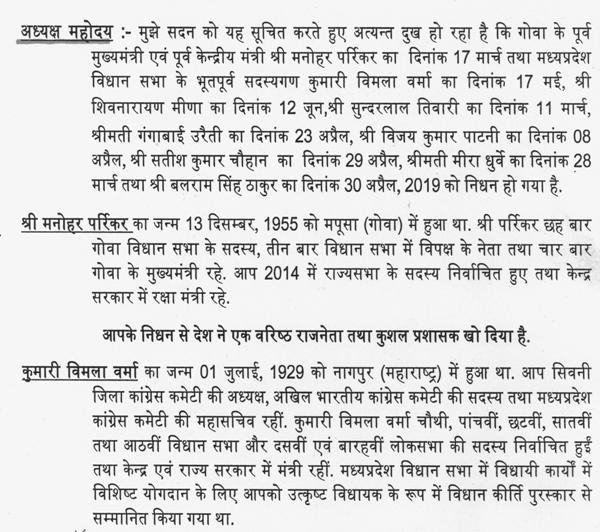 नेता प्रतिपक्ष (श्री गोपाल भार्गव):- माननीय अध्यक्ष महोदय, आज हम ऐसी अनेक शख्शियतों, अनेक व्यक्तित्वों के लिये जो हमारे बीच में नहीं रहे. विधान सभा के पिछले सत्र से लेकर इस सत्र की अवधि के बीच में, ऐसे सारे महापुरूषों के लिये जिन लोगों ने अपने विधायी जीवन में इस राज्य और देश की सेवा की है, ऐसे सभी लोगों के लिये अपनी भाव-भीनी श्रद्धांजलि अर्पित कर रहे हैं.
