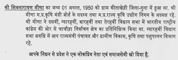 अध्यक्ष महोदय, श्री शिवनारायण मीणा जी हमारे साथ में विधायक भी रहे जहां तक मुझे जानकारी है कि वह तीर्थयात्रा पर गये थे, उस दौरान उनका हृदय गति रूक जाने के कारण स्वर्गवास हुआ वह चाचौड़ा क्षेत्र के अच्छे विधायक थे वह वहां का प्रतिनिधित्व करते थे. जहां तक मुझे स्मरण है माननीय दिग्विजय सिंह जी का जब कार्यकाल शुरू हुआ तब मुख्यमंत्री बनने के बाद उनको विधायक बनना था तो चाचौड़ा से उप चुनाव में दिग्विजय सिंह विधायक बने थे. उन्होंने अपने विधायक पद का त्याग किया इस कारण से वह हमेशा स्मरण किये जाते रहेंगे.