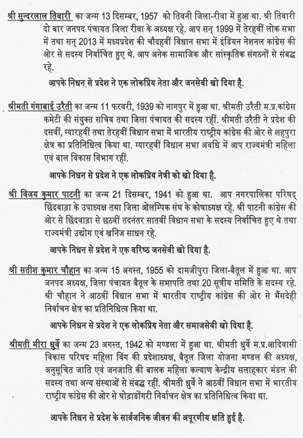 अध्यक्ष महोदय,श्रीमती गंगाबाई उरैती मंत्री थीं, मेरे साथ में विधायक भी रही हैं. जनजाति के क्षेत्र में उन्होंने काम किया है इसके लिये वह हमेशा स्मरण की जाती रहेंगी. मैं उनके प्रति श्रद्धांजलि अर्पित करता हूं.
