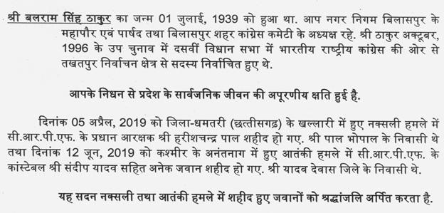 अध्यक्ष महोदय, श्री बलराम सिंह जी ठाकुर भी मेरे साथ में विधायक रहे वह जुझारू नेता थे वह उप चुनाव में जीत कर आये थे. मैं उनके प्रति श्रद्धांजलि अर्पित करता हूं.