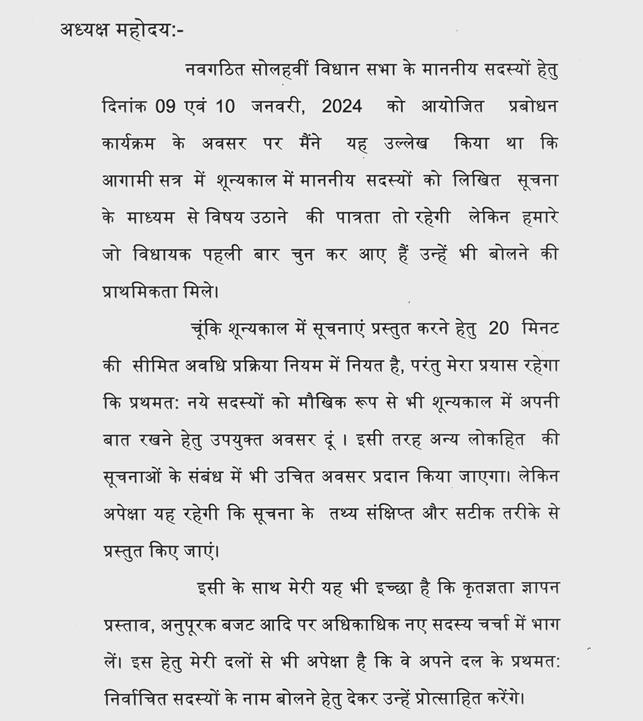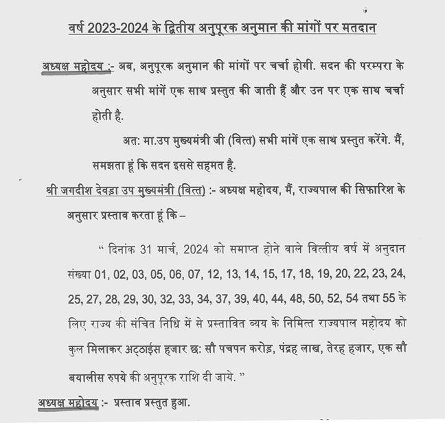 मेरा पक्ष और प्रतिपक्ष दोनों के माननीय नेताओं से अनुरोध है, श्री हेमंत जी यहां बैठे हुए हैं, प्रहलाद जी संसदीय कार्यमंत्री जी को अवगत करावें कि कुल मिलाकर जितने सदस्य हैं, सामान्य तौर पर हमें यह कोशिश करना चाहिए की अपने दल के ज्यादा से ज्यादा सदस्य बोल पायें, तो जो सदस्य अनुपूरक पर बोल चुके हैं, वह अब दूसरे पर छोड़ेंगे. मैं संख्या कम करने के लिये नहीं बोल रहा हूं,यह सुझाव दोनों पक्षों को दे रहा हूं तो दूसरे लोग और नये लोगों को ज्यादा मौका मिल जायेगा. मैंने इसे इस दृष्टि से देखा कि दोहराव हो रहा है, तो थोड़ा इस दिशा में चिंता करेंगे तो ठीक रहेगा.