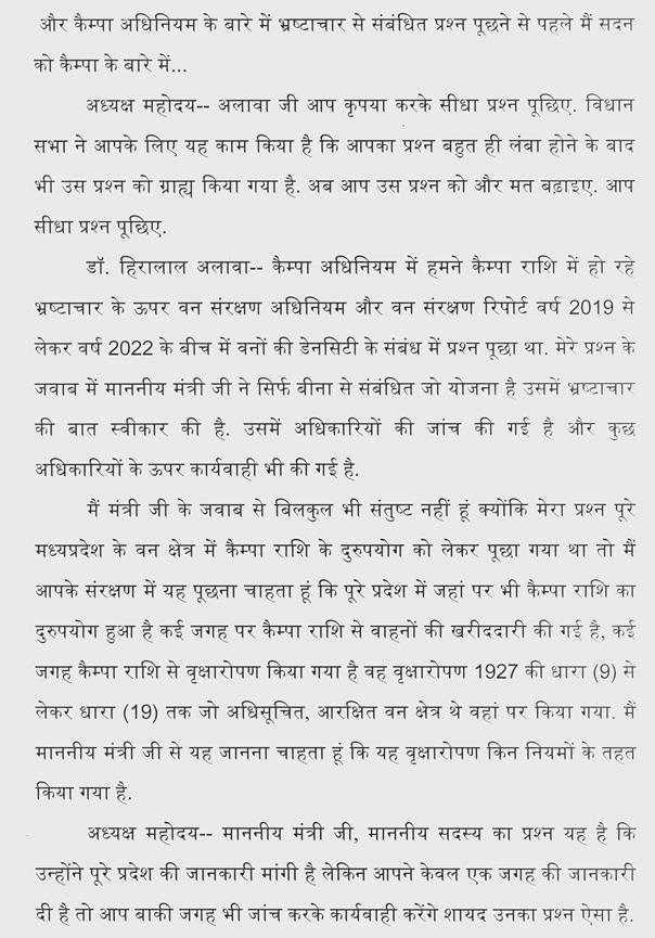 डॉ. हिरालाल अलावा- माननीय अध्यक्ष महोदय, मैं आपका संरक्षण चाहते हुए, मंत्री जी से पूछना चाहूंगा और इस सदन को इस बात की जानकारी भी देना चाह रहा हूं कि मेरा प्रश्न कैम्पा अधिनियम से संबंधित हैख् जो जंगलों से संबंधित है और जंगल हम सभी के लिए महत्वपूर्ण है. कैम्पा अधिनियम में किस प्रकार भ्रष्टाचार हो रहा है, इसे लेकर मेरा प्रश्न है.