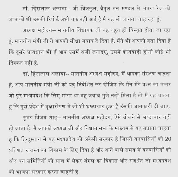 अध्यक्ष महोदय- सज्जन सिंह जी, कृपया बैठ जाईये. वैसे भी बारात में सिर्फ दूल्हा ही साफा नहीं बांधता है और भी बहुत-से लोग बांधते हैं तो इसे वैसा ही मानिये कि खुशी व्यक्त कर रहे हैं. प्रश्न क्रमांक 1 अलावा जी. कृपया संक्षेप में शुरू करें.