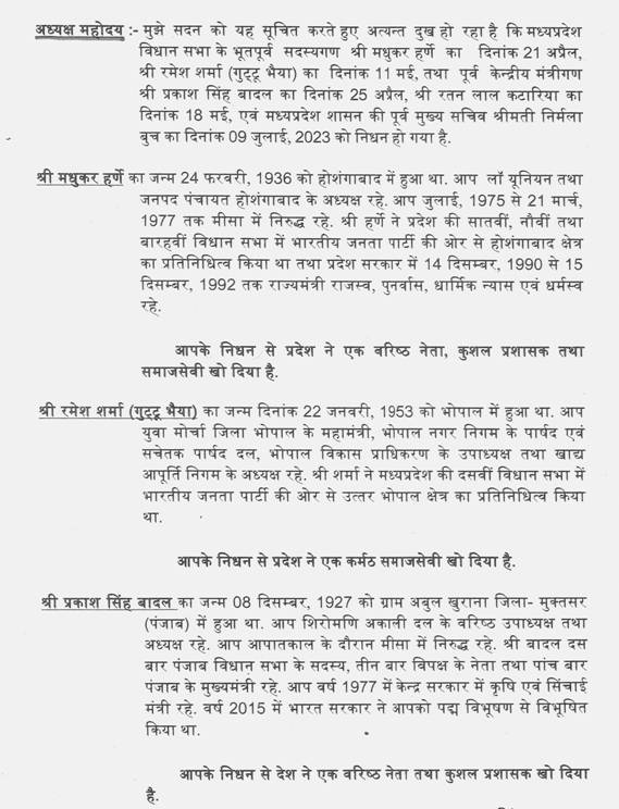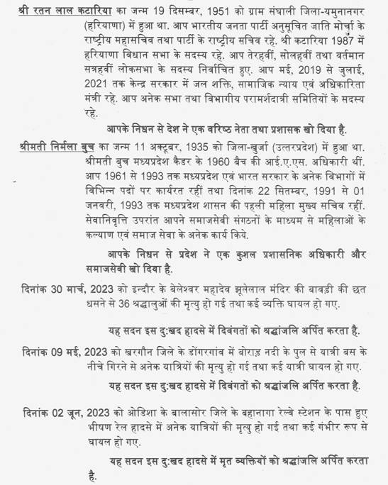 अध्यक्ष महोदय, इंदौर में दिनांक 30 मार्च, 2023 को जो घटना हुई, बेलेश्वर महादेव झूलेलाल मंदिर में मध्यप्रदेश के 30 साथियों की मृत्यु हुई. इसके साथ ही दिनांक 9 मई, 2023 को खरगौन जिले में डोंगरगांव में बोराड़ नदी पुल से यात्री बस के नीचे गिरने से हमारे प्रदेश के अनेक भाइयों की मृत्यु हुई. दिनांक 2 जून, 2023 को ओड़िसा जिले के बालासोर जिले के बहानागा रेल्वे स्टेशन के पास जो रेल दुर्घटना हुई है, तमाम रेल यात्री इस घटना में स्वर्गवासी हुए और बहुत से लोग घायल हुए, वे सब जो आज हमारे बीच में नहीं हैं, उन सभी के चरणों में श्रद्धानमन करता हूं, अपनी ओर से और अपने दल की ओर से ईश्वर से प्रार्थना करता हूं कि ईश्वर उनकी आत्मा को शांति पहुंचाए और परिवारों को इस गहन दुख को सहने की क्षमता प्रदान करे.