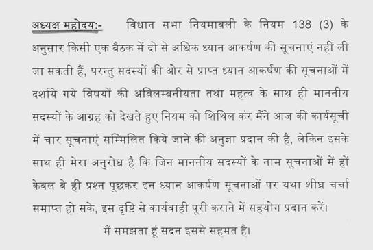 (श्री बाला बच्चन, सदस्य के नेतृत्व में इंडियन नेशनल काँग्रेस के सदस्यगण द्वारा आदिवासियों पर हो रहे अत्याचार के विरोध में गर्भगृह में प्रवेश किया गया)