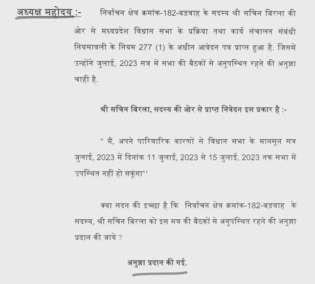 निर्वाचन क्षेत्र क्रमांक 182 बड़वाह से निर्वाचित सदस्य, श्री सचिन बिरला को विधान सभा के जुलाई, 2023 सत्र की बैठकों से अनुपस्थित रहने की अनुज्ञा