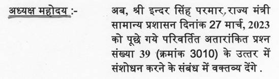राज्यमंत्री, सामान्य प्रशासन (श्री इन्दर सिंह परमार)--माननीय अध्यक्ष महोदय, आज दिनांक 27.3.2023 परिवर्तित अतारांकित प्रश्न संख्या-39 (क्रमांक 3010) में निम्नानुसार संशोधन चाहता हूं:-