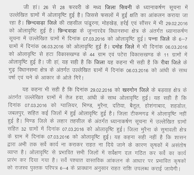 श्री राजेन्द्र शुक्ल- माननीय अध्यक्ष महोदय, फिर जानकारी की कमी सामने आ गई, कमलेश्वर जी को मैं बताना चाहता हूं कि नियामक आयोग ने किसानों के लिए बिजली के टेरिफ को 6300 पर एच.पी. प्रतिवर्ष किया हुआ है । यदि साल भर में उसका 5 एच.पी. का कनेक्शन होगा तो उसको 36,000 रूपये देना पड़ेगा. मध्यप्रदेश की सरकार ने 6,300 रूपये की जगह 1,200 रूपये लेने का फैसला किया है. बाकि राज्य के खजाने से बिजली कम्पनी को 7,400 करोड़ रूपये सिर्फ किसानों को सब्सिडी दे रहे हैं.