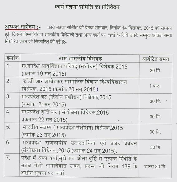सायं 05:00 बजे विधान सभा की कार्यवाही मंगलवार, दिनांक 15 दिसम्बर, 2015 (24 अग्रहायण,शक संवत्1937) के प्रात: 10:30 बजे तक के लिए स्थगित ।