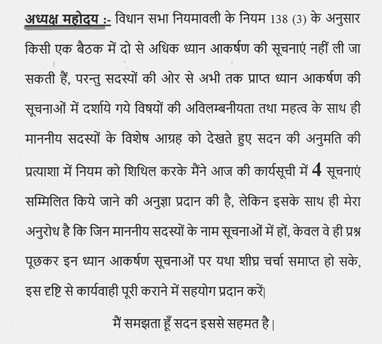 अध्यक्ष महोदय-- वर्ष 2021-22 के आय-व्ययक (बजट) पर सामान्य चर्चा माननीय सदस्यों द्वारा विस्तार से की गई थी तदुपरान्त विभागवार मांगों पर 8 मार्च से चर्चा प्रारंभ हुई पिछले दिनों भोजन अवकाश स्थगित करने और सायं साढ़े पाँच बजे के उपरान्त भी समय वृद्धि की जाकर कार्यवाही चलाने के बाद अभी केवल माननीय मुख्यमंत्री और माननीय लोक निर्माण मंत्री से संबंधित विभागों की मांगों पर ही चर्चा हो सकी है. अन्य विभागों की मांगों पर चर्चा होना शेष है साथ ही कोरोना का प्रकोप पुनः बढ़ रहा है, हाल में कतिपय माननीय सदस्य भी इसके संक्रमण से प्रभावित हुए हैं. अतः इस स्थिति में माननीय सदस्यों की सुरक्षा के साथ विधायी कार्य शीघ्र संपादन के लिए विधायक दलों के मुख्य सचेतकों से अनुरोध है कि कृपया कार्य सूची में शामिल विभागीय मांगों पर चर्चा हेतु सीमित संख्या में ही दोनों पक्षों के सदस्यों के नाम बोलने के लिए दें तथा माननीय सदस्यों से अनुरोध है कि इस प्रक्रिया में कृपया सहयोग प्रदान करें, जिससे कि तत्परता से विभागों की मांगों पर चर्चा पूर्ण हो सके तथा उसके उपरान्त विनियोग, अन्य विधेयक और विधि विषयक कार्य पूर्ण किया जा सके.