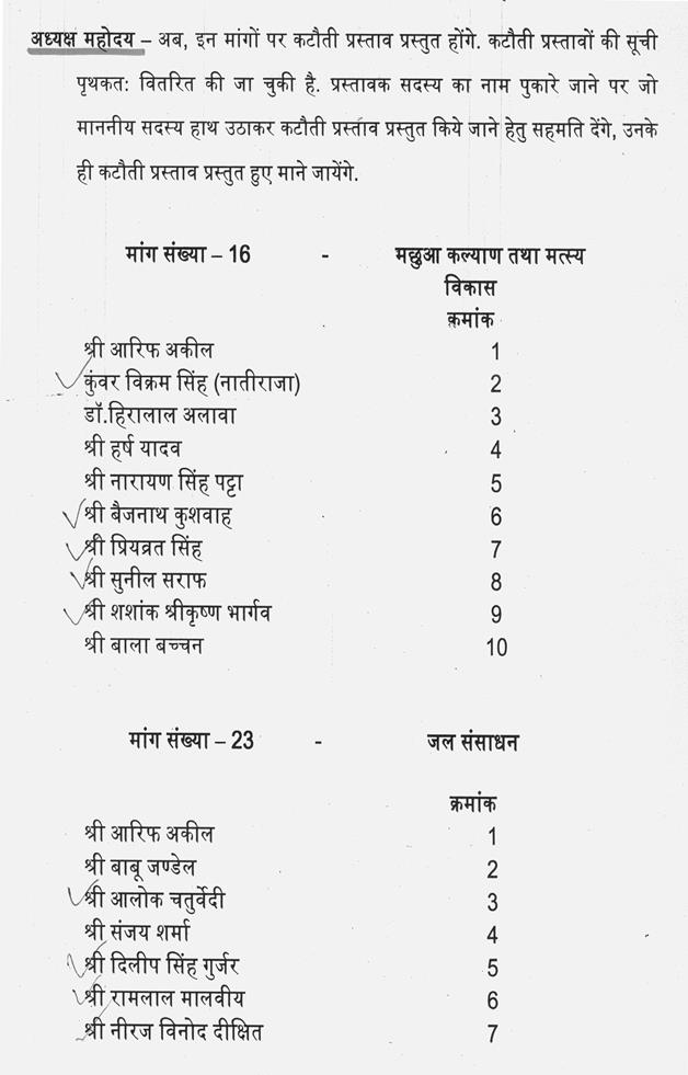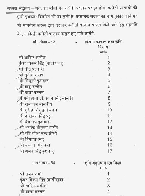 सभापति महोदय-- इस विभाग की मांगों पर दोनों पक्षों के तीस सदस्यों के नाम हैं अत: माननीय सदस्यों से अनुरोध है कि कृपया संक्षेप में तीन-तीन मिनट में अपने क्षेत्र की समस्याओं को रखने का कष्ट करें. जिससे कार्यवाही पूर्ण हो सके.