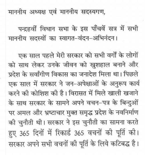 अध्यक्ष महोदय -- राज्यपाल महोदय के द्वारा अभिभाषण का प्रथम एवं अंतिम पैरा ग्राफ सदन में पढा गया. शेष अभिभाषण पढ़ा हुआ माना जायेगा..(व्यवधान)