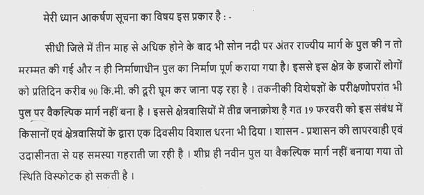 सभापति महोदय, एक बात और है कि जिला स्तर के बड़े अधिकारी या जिम्मेदार पदाधिकारी मंत्री अगर उस क्षेत्र में आते हैं तो जो उस क्षेत्र के जनप्रतिनिधि हैं, उनको सूचना प्रशासन के माध्यम से पहुँचनी चाहिए. माननीय मंत्री जी, आप इस बात को भी नोट करें. मैंने माननीय मुख्यमंत्री जी को भी इस संबंध में पत्र लिखा था, मुख्य सचिव साहब को भी पत्र लिखा था, उन्होंने कलेक्टर साहब को लिख दिया, कलेक्टर साहब से जानकारी मांगी, लेकिन यह सिर्फ लिखना हुआ है, इसका पालन कभी नहीं हुआ.