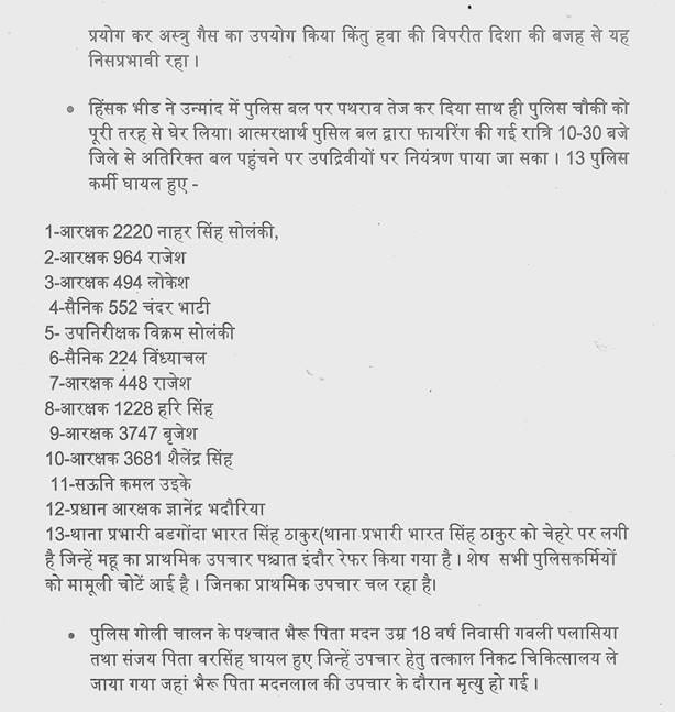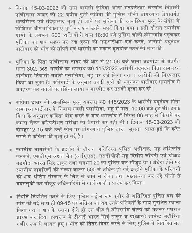 गृह मंत्री (डॉ.नरोत्तम मिश्र ) - माननीय अध्यक्ष महोदय, दुखद घटना है. घटना में दो तरह की बातें प्रकाश में आई हैं. एक जैसा सम्मानित नेता प्रतिपक्ष आदरणीय गोविन्द सिंह जी ने कहा और दूसरा पक्ष जो वह बिटिया थी वह उसके साथ में रहती थी और घर में पानी गर्म करने की जो राड होती है उसको जब बाल्टी में डाला तो करंट लगा और उसकी दुखद मृत्यु हो गई. इससे आक्रोषित होकर बिटिया के मायके वालों ने उसको हत्या कहा और जाम लगाया और जाम लगने के बाद उस व्यक्ति को गिरफ्तार कर लिया गया. जब वह व्यक्ति गिरफ्तार होकर थाने आ गया तो यह पूरा मूवमेंट थाने की ओर आया कि हम खुद न्याय करेंगे कि हम खुद न्याय करेंगे. इसने हत्या की है और थाने पर उसके बाद पथराव और हमला हुआ जिसमें वहां का थाना प्रभारी गंभीर घायल हुआ जिन्हें इन्दौर रेफर करके भर्ती किया गया है और 13 पुलिस के जवान घायल हुए.अलग-अलग स्थानों पर उनके चोटें आईं. उसमें घायल हुए. अलग अलग स्थानों पर उनके शरीर में चोटें आईं और इसी बचाव में गोली चली, जिसमें यह दुखद घटना घटित हुई है. बिटिया का फ्यूनरल हो गया है और उसकी भी यह मुख्यमंत्री जी ने घटना की मजिस्ट्रियल जांच यह दो तरह की बात जैसे सम्मानित नेता प्रतिपक्ष कह रहे हैं, वह वाली बात और यह दूसरी बात जो दोनों बातें आई हैं, इनकी सत्यता की और पूरी घटना की और मजिस्ट्रियल जांच के आदेश दिये हैं. थोड़ी देर में स्थिति और साफ हो जायेगी. पी.एम. रिपोर्ट आने वाली है.