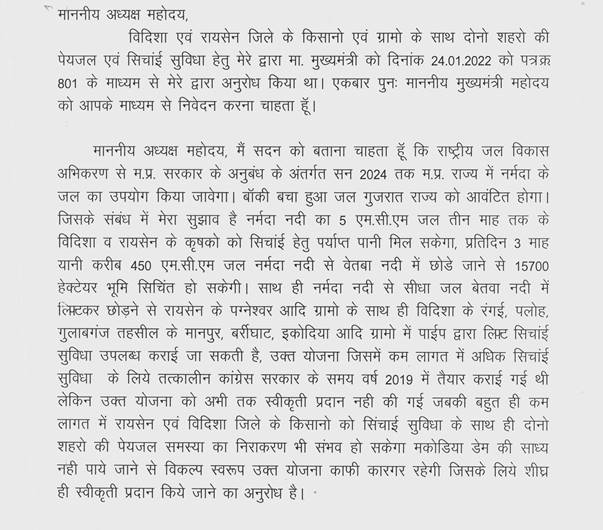 माननीय अध्यक्ष महोदय, नर्मदा घाटी विकास विभाग के हमारे मंत्री भारत सिंह जी, यहां बैठे हैं. उज्जैन और शाजापुर के लिए जो बहुद्देशीय योजना बनी है, ये मेरे महिदपुर से होकर निकल रही है, मेरा एक क्षेत्र 25-30 गांवों का ऐसा है, इस योजना में पानी भी पर्याप्त है, मैं, आपके माध्यम से मंत्री जी से आग्रह करूंगा कि इन 25-30 गांवों को भी पानी देने की घोषणा, जब मंत्री जी अपना उत्तर दें, तो जरूर करें.