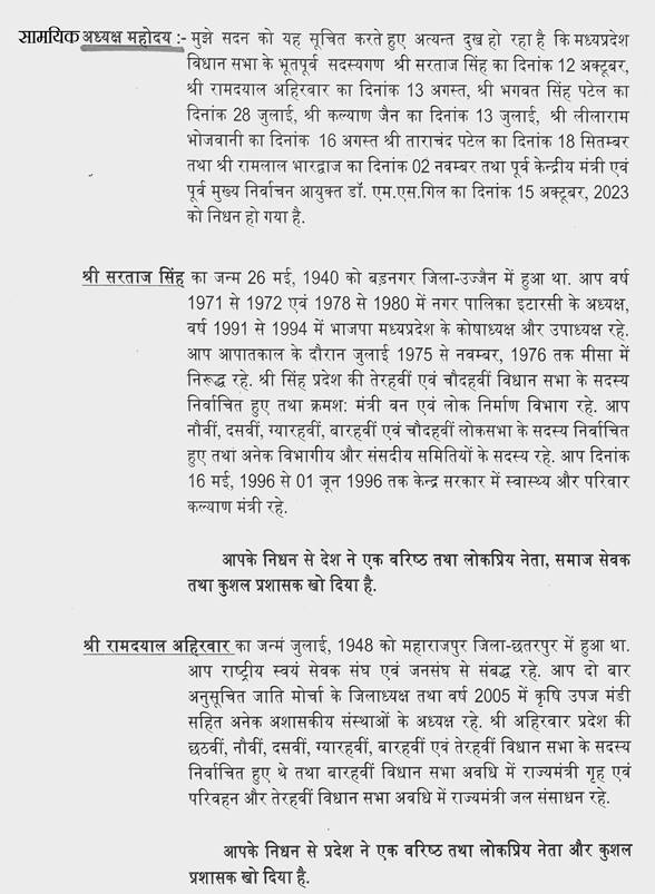 मुख्यमंत्री (डॉ. मोहन यादव) -- माननीय अध्यक्ष महोदय, आज मध्यप्रदेश विधान सभा में सदन के सदस्य रहे दिवंगत हुये हमारे राजनेताओं को मेरी ओर से हार्दिक श्रद्धांजलि.