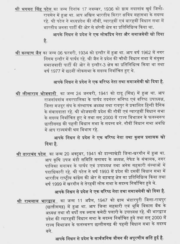 स्वर्गीय श्री लीलाराम भोजवानी जी, वरिष्ठ संवाददाता रहे. उन्होंने हमेशा मजदूरों के लिये लड़ाई लड़ी. स्वर्गीय ताराचंद पटेल जी कांग्रेस के बड़े नेता थे. वे स्वर्गीय सुभाष यादव जी के काफी करीबी थे. दोनों की एक आत्मीयता थी. खरगौन क्षेत्र के लिए सार्वजनिक अपूरणीय क्षति है. स्वर्गीय रामलाल भारद्वाज जी, स्वर्गीय एम.एस. गिल साहब, जिस प्रकार से अभी आपने ईवीएम का बताया, सबका अपना योगदान रहा है. मैं इतना ही कहना चाहता हूँ कि जिन्होंने अपने जीवन को दूसरों के लिए समर्पित किया है, उन्होंने कितना त्याग किया, यह उनका परिवार जानता है. परिवार के लिए कई जवाबदारियां रहती हैं, जब सार्वजनिक जीवन में आते हैं तो मैं ऐसा मानता हूँ कि आपको आपकी भावनाओं से समझौता करना पड़ता है. त्याग करना पड़ता है. लेकिन मनुष्य हैं, इंसान हैं, अपनी भावनाओं से अलग नहीं जा सकते और कुछ चीजें पाने के लिए आपको छोड़ना भी पड़ता है. लेकिन मैं इसे पाना नहीं मानता हूँ, इसे सार्वजनिक जीवन में एक त्याग की भावना मानता हूँ कि आपने आपके साथ के जो कॉलेज के दोस्त थे, आपके साथ पढ़ने वाले लोग थे. साथी थे. कई ऐसे हैं, जो आपके सफर में, सार्वजनिक जीवन में साथ में रहते हैं, उन्हें आप कम समय दे पाते हैं, वे आपसे नाराज भी होते हैं. लेकिन जो योगदान भविष्य में आप देते हैं, निश्चित तौर से यह उन साथियों को याद रहता है. मैं इतना ही कहना चाहता हूँ. दिवंगत सदस्यों के निधन से सार्वजनिक अपूरणीय क्षति हुई. मैं अपने दल की ओर से शोकाकुल परिवारों को संवेदना प्रकट करता हूँ. धन्यवाद.