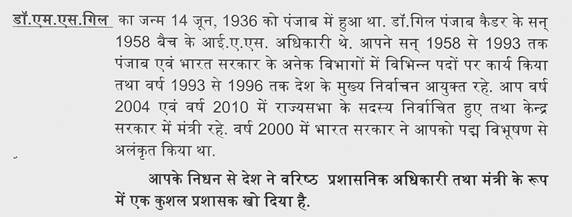 डॉ.एम.एस.गिल,पूर्व केन्द्रीय मंत्री एवं पूर्व मुख्य चुनाव आयुक्त. पूरा नाम श्री मनोहर सिंह गिल. जन्म स्थान 14 जून,1936. कुशल नौकरशाह,राजनीतिज्ञ,लेखक. वर्ष 1996 से लेकर 2001 के बीच आप भारत के मुख्य चुनाव आयुक्त रहे. आपके कार्यकाल में चुनावों में ई.वी.एम. मशीनों का उपयोग प्रारम्भ हुआ है. जिससे मतदान में धांधली समाप्त हुई. वर्ष 2000 में आप पद्मविभूषण से सम्मानित किये गये. वर्ष,2004 से 2016 के बीच आप राज्यसभा सदस्य चुने गये. वर्ष 2009 से जनवरी,2011 तक केन्द्रीय राज्यमंत्री के रूप में आपने युवा एवं खेल मंत्रालय का आपने नेतृत्व किया. आपके कार्यकाल में भारत में राष्ट्रमण्डल खेलों का आयोजन हुआ. जनवरी,2011 से जुलाई,2011 के बीच आपने सांख्यिकी एवं कार्यक्रम क्रियान्वयन मंत्री का उत्तरदायित्व संभाला है. 15 अक्टूबर,2023 के दिन आपका दुखद निधन हुआ. ई.वी.एम. मशीनों का इस्तेमाल कर भारतीय लोकतंत्र को दुनिया भर में विश्वसनीयता दिलाने के लिये आपको सदैव स्मरण किया जायेगा.
