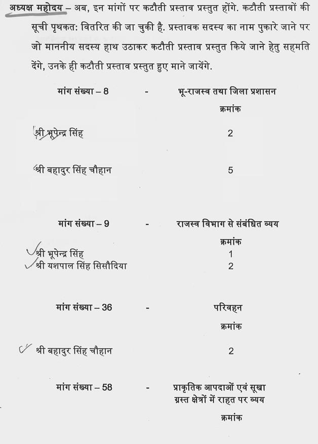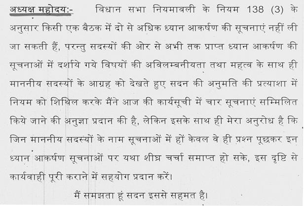 अध्यक्ष महोदय -- मैं आपकी बात से सहमत हूँ. संबंधित मंत्रियों से अनुरोध है कि वे अपनी माननीय विभाग के अधिकारियों को सूचित कर दें, जो नए विधायक हैं, अगर 11वें घण्टे में उनको उत्तर मिलेगा तो वे क्या तैयारी करेंगे, क्या प्रश्न करेंगे. इस बात का कम से कम विशेष ध्यान रखा जाए.