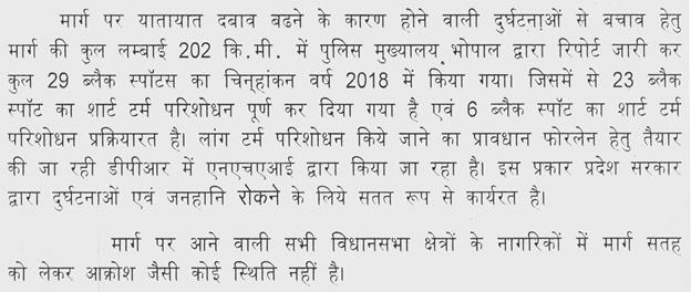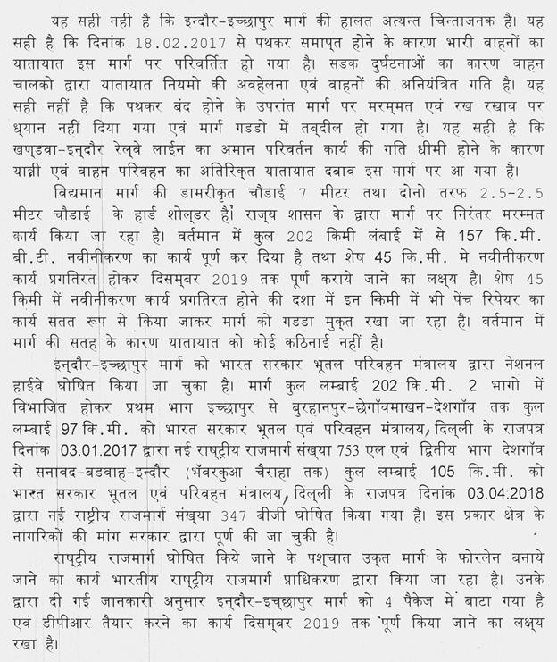 श्री कमलेश्वर पटेल-- माननीय अध्यक्ष महोदय, माननीय विधायक जी का जो प्रश्न है बहुत लाजमी है और हम समझते हैं कि सभी जन प्रतिनिधियों को अपने क्षेत्र के प्रति और विकास कार्यों के प्रति चिंतित रहना चाहिए. अध्यक्ष महोदय, यह जो कार्य स्वीकृति की बात की है माननीय विधायक जी ने यह 15.12.2017, 19.7.2018 एवं 28.2. 2019 को निविदाएँ आमंत्रित की गई थीं इसमें जो प्रगतिरत कार्य का उल्लेख किया है. उसमें एक मार्ग को छोड़कर बाकी मैंने खुद आपके जो प्रगतिरत मार्ग का उल्लेख किया विभाग ने, उसके बारे में हमने स्वयं संज्ञान में लेते हुए और विभागीय अधिकारियों को निर्देशित भी कर रहे हैं कि जो वस्तु स्थिति हो उसके बारे में परीक्षण कराकर माननीय विधायक जी से स्वयं हमारे जो विभाग के अधिकारी हैं, आप से चर्चा करेंगे क्योंकि एक मार्ग पर ही सिर्फ अभी तक अर्थ वर्क का कार्य जो चल रहा है उसी का सिर्फ भुगतान किया गया है बाकी जो सात प्रगतिरत मार्ग हैं उन पर अभी किसी प्रकार का भुगतान नहीं हुआ है, मार्गों पर सिर्फ सफाई एवं सर्वे कार्य चल रहा है. भुगतान मात्र बी.टी. मार्ग पर हुआ है, तो आगे जब भी, हम समझते हैं कि ये 6 महीने के अन्दर आपका जो प्रगतिरत मार्ग है वह पूर्ण हो जाएगा, जिसका उल्लेख किया है माननीय अध्यक्ष महोदय, हम आपके माध्यम से निर्देशित कर रहे हैं कि 6 महीने के अन्दर जो अधूरे कार्य हैं, जो प्रगतिरत हैं वे पूर्ण हो जाएँ और कुछ मार्ग ऐसे हैं जिन पर निविदाएँ तो आमंत्रित की गई थीं पर अध्यक्ष महोदय, ठेकेदार द्वारा वह कार्य छोड़कर चले जाने की वजह से दुबारा निविदाएँ आमंत्रित की जा रही हैं और जल्दी माननीय विधायक जी से भी हम निवेदन करेंगे कि क्या वजह है कि आपके यहाँ ठेकेदार निविदाएँ छोड़कर जा रहे हैं. आपका भी संरक्षण चाहिए. आपके भी संज्ञान में कोई ऐसे ठेकेदार हों, तो आप भी उनको पार्टिसिपेट करने के लिए निर्देशित करेंगे और जो अधूरे कार्य हैं, वह जल्द पूरे कर लिए जाएँगे.