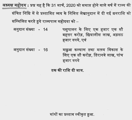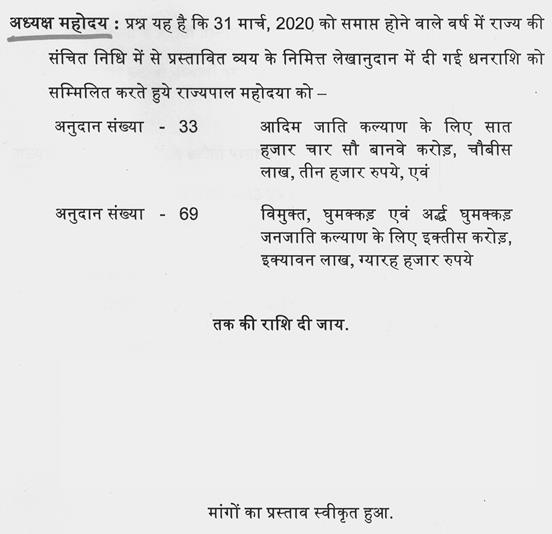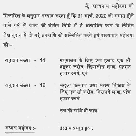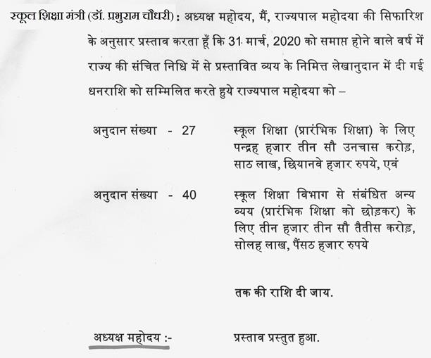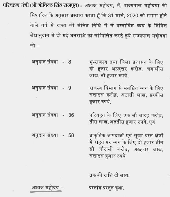 श्री अजय विश्नोई-- आंकडों की बात आपने की है और गलत की है इसलिए आपको ध्यान दिलाना चाह रहा हूं पिछले साल का आप देखेंगे तो बजट का जो अनुमान था वह सत्रह हजार सात सौ संतानवे करोड़ आपने अभी आज की तारीख में नौ हजार आठ सौ और वह आठ हजार और मिला लीजिए तो सत्रह हजार आठ सौ ही है. आपने उसमें कुछ बढ़ाया नहीं है. जो प्रावधान पिछले वर्ष 2018-2019 का था वही वर्ष 2019-2020 का है. आंकडों की बात है आपकी छपी हुई किताब की बात है.