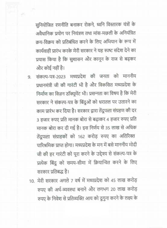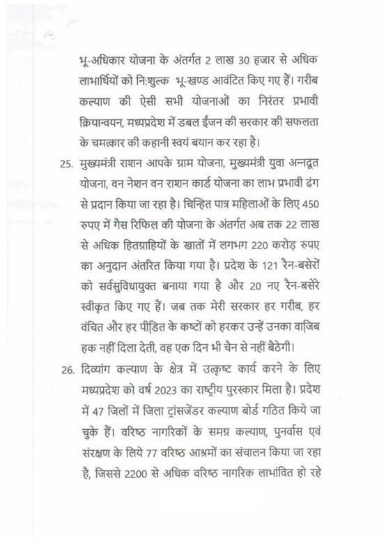 मुख्यमंत्री, (डॉ. मोहन यादव)--माननीय अध्यक्ष महोदय, अभी तक माननीय सदन की यह परम्परा रही है कि माननीय महामहिम जी के अभिभाषण के बाद कोई बात नहीं होती है, सदन स्थगित होता है. जो भी बात करनी है अगले दिन में कर लेंगे. बहुत बहुत धन्यवाद.