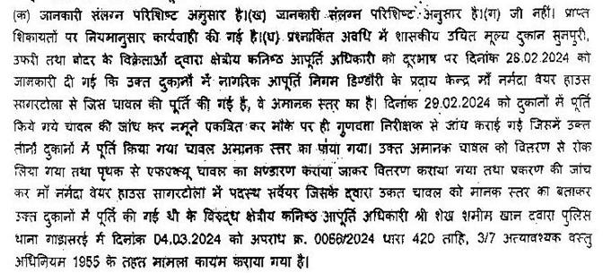 13. ( *क्र. 1680 ) श्री ओमकार सिंह मरकाम : क्या खाद्य मंत्री महोदय यह बताने की कृपा करेंगे कि (क) दिनांक 01 जनवरी, 2024 से प्रश्न दिनांक तक प्रमुख सचिव/आयुक्त/संचालक खाद्य किस-किस अधिकारियों के विरूद्ध कब-कब किस-किस के द्वारा क्या-क्या शिकायत की गई? शिकायतवार जानकारी दें। (ख) प्रश्नांश (क) अनुसार प्राप्त शिकायतों में कब-कब, क्या-क्या नियमानुसार कार्यवाही की गई? (ग) प्रश्नांश (क) अनुसार प्राप्त शिकायतों में जिसमें कार्यवाही नहीं की गई, उन शिकायतों में कार्यवाही क्यों नहीं की गई? कार्यवाही नहीं करने के लिए कौन जिम्मेदार है? कब तक कार्यवाही की जायेगी? (घ) दिनांक 01 जनवरी, 2024 से आज दिनांक तक कहां-कहां से घटिया चावल वितरण की शिकायत किस-किस ने कब-कब की एवं विभागीय जांच में कब-कब, किस-किस अधिकारी ने घटिया चावल पकड़ा, उसमें कब-कब क्या-क्या कार्यवाही हुई?