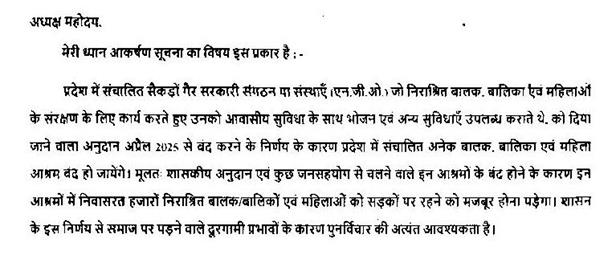 सुश्री निर्मला भूरिया - माननीय अध्यक्ष महोदय, माननीय सदस्य जी ने जो प्रश्न किया है. मैं उन्हें फिर आश्वस्त करना चाहती हूँ कि ऐसी संस्थाएं जो चल रही हैं, जो एनजीओस चला भी रहे हैं और कुछ जन सहयोग से भी चलाते हैं, तो प्रकरण शासन के समक्ष है, यह विचाराधीन हैं और हम किसी भी महिला और बालक को इस स्थिति में नहीं जाने देंगे और करेंगे. संस्थाओं के संचालन के संबंध में वित्तीय नॉर्म्स हैं, वे निर्धारित हैं.