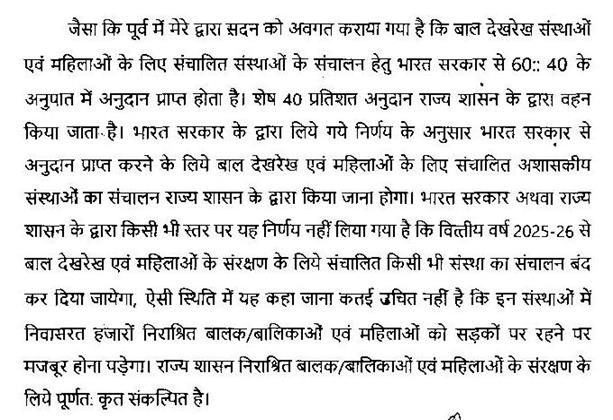सुश्री निर्मला भूरिया - माननीय अध्यक्ष महोदय, मैं हमारे वरिष्ठ माननीय सदस्य को बताना चाहूँगी कि 60 : 40 के रेशो से जो संस्थाएं संचालित होती हैं और जो चिन्ता महिलाओं और बालकों की माननीय सदस्य जी ने की है, उन्हें हम किसी भी हालत में इस स्थिति में नहीं जाने देंगे कि वे इधर-उधर भटकें और शासन स्तर पर हम लोग जरूर से जरूर करेंगे.