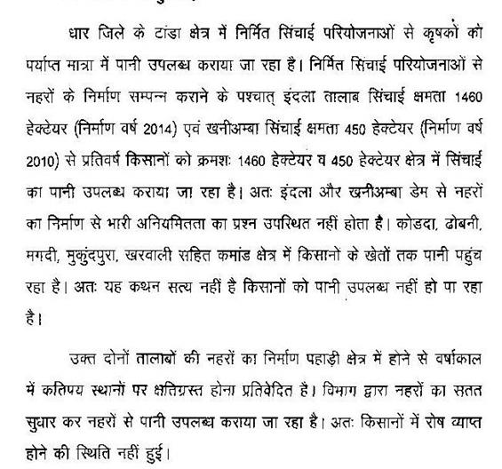 (2) धार जिले के टाण्डा क्षेत्र में सिंचाई परियोजना पर कार्यवाही